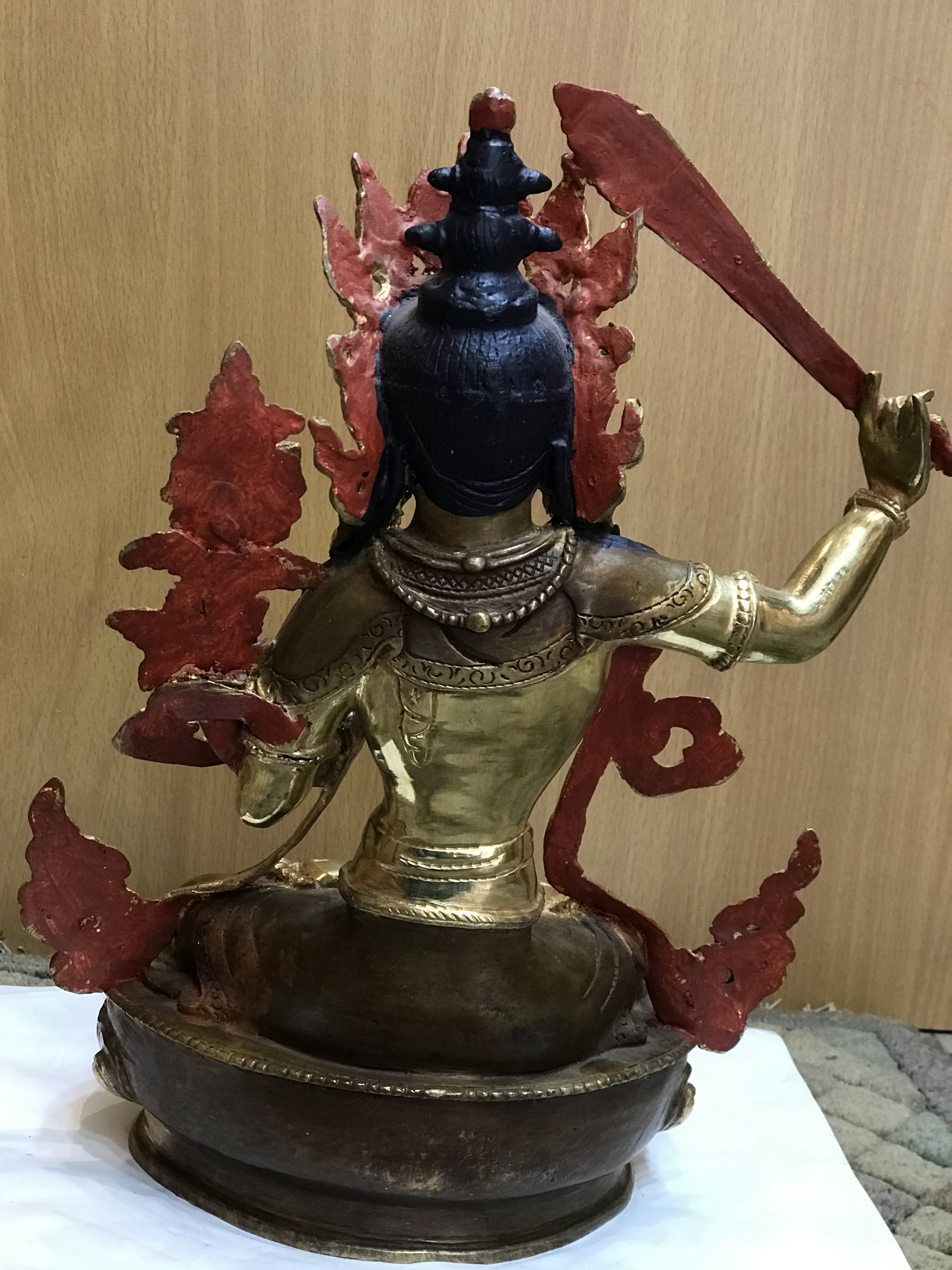 Jampelyang is also known as Manjushri – the “Bodhisattva of Perfected Wisdom”. Inside the lotus blossom growing over his left shoulder rests the Book of “Perfected Wisdom” which is a collection of the Prajnaparamita Sutras. These sutras are where Jampelyang originated in the Buddhist texts. Indeed, Jampelyang is one of the oldest and most venerable bodhisattvas in the Buddhist pantheon.
