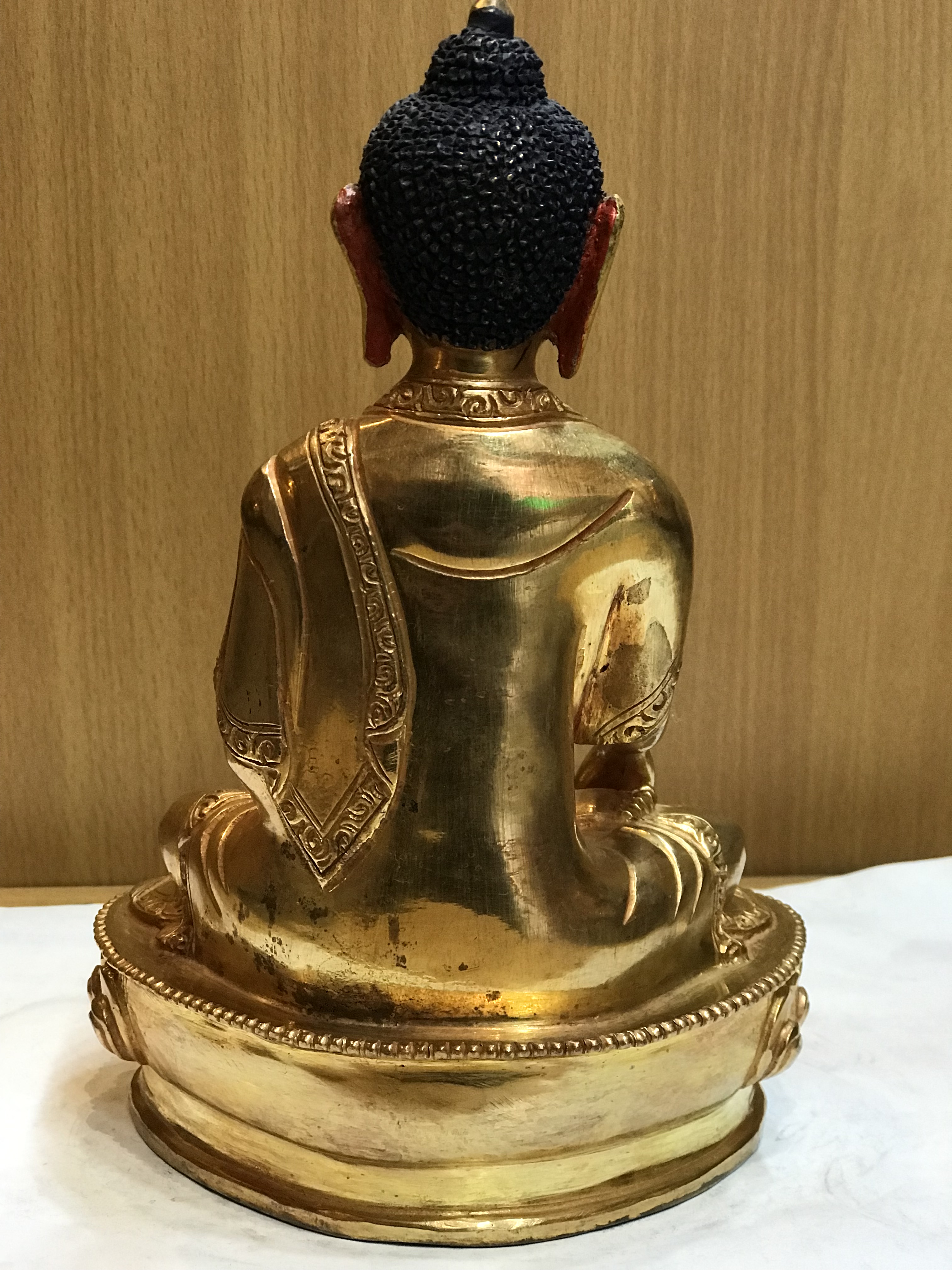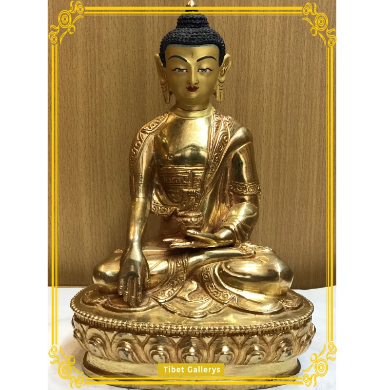 This handmade Shakyamuni statue was created by the Nepali artisans using traditional sculpting methods. As a result, the statue has finely hand carved engravings on the robe and pedestal. Additionally, the face was hand painted giving life like expression to the statue. We also use the fire gilding method to derive a 24K gold gilded finish. Your statue will remain tarnish free and imbued with a beautiful golden luster. For many centuries the Nepali artisans have been the preferred source for sculpture used by the Buddhist monasteries. As a result, if you purchase our handmade Shakyamuni statue rest assured you have procured a monastic quality statue.