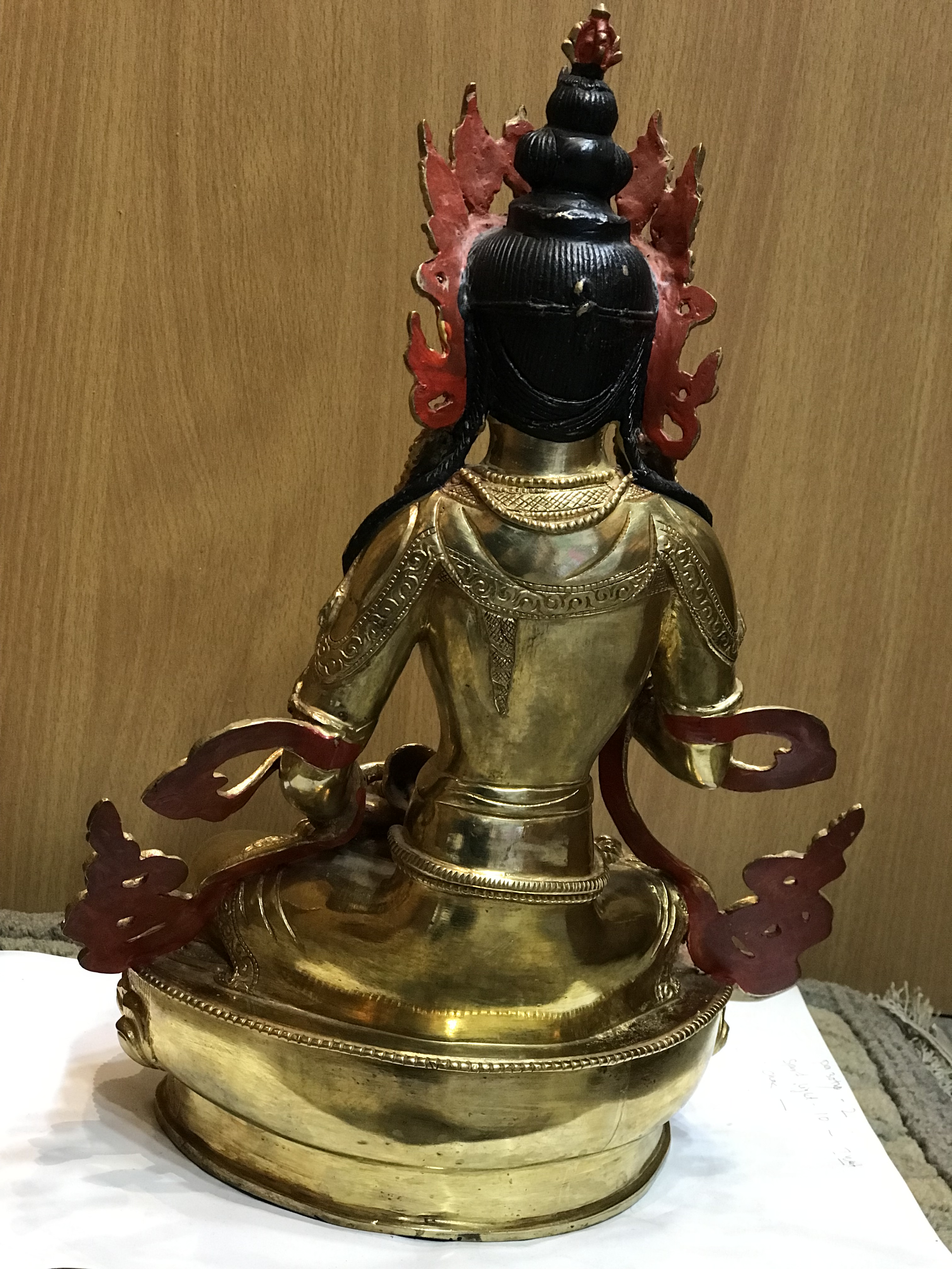 Our Tibetan Dorje Sempa statue is depicted wearing the crown and jewels of a Bodhisattva. The crown and jewels can be embedded with turquoise and red coral stones at the request of the buyer. The color turquoise is a special combination of blue and green. Indeed, blue signifies the purity of the Buddhas and green symbolizes their readiness to act. The special adornments embellish the statue and will inspire all those who lay their eyes on it.