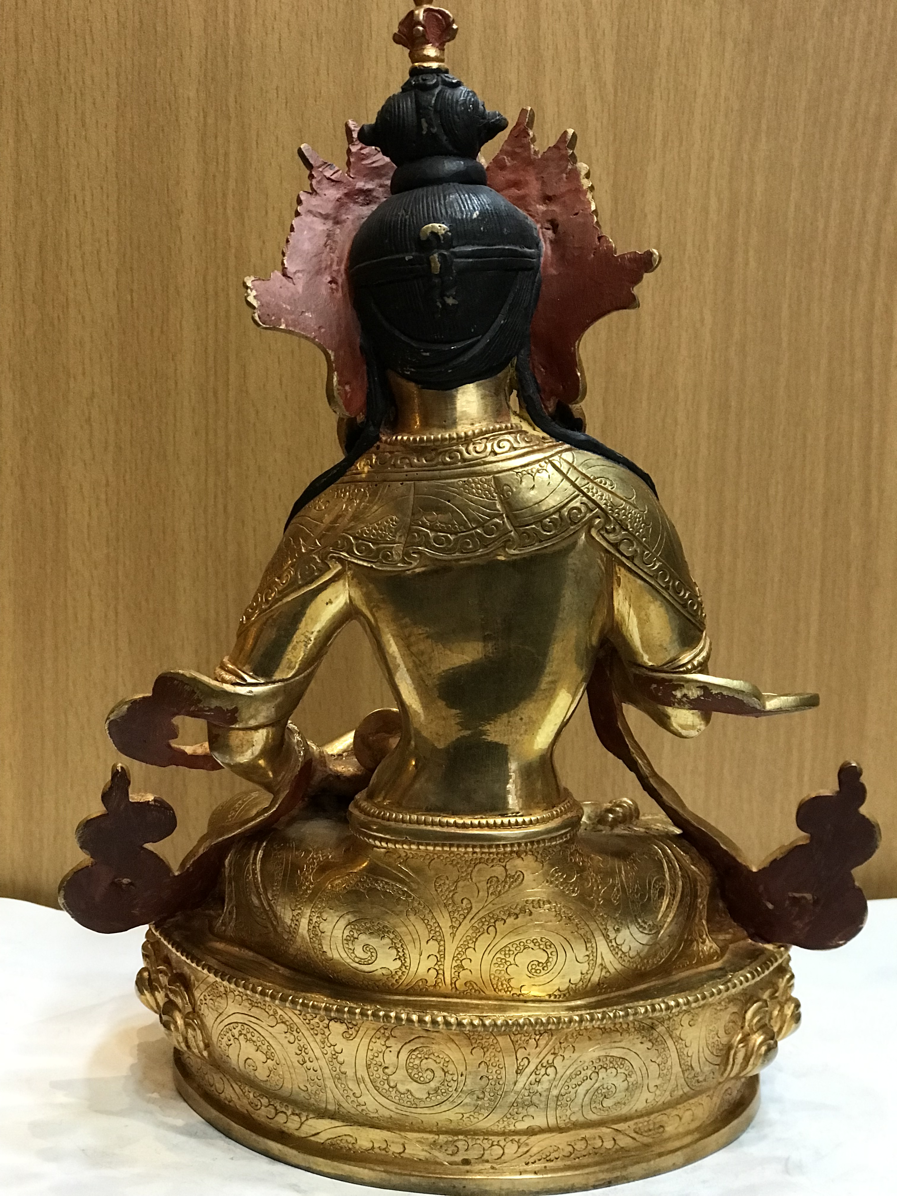 Our Tibetan Dorje Sempa statue is depicted wearing the crown and jewels of a Bodhisattva. The crown and jewels can be embedded with turquoise and red coral stones at the request of the buyer. The color turquoise is a special combination of blue and green. Indeed, blue signifies the purity of the Buddhas and green symbolizes their readiness to act. The special adornments embellish the statue and will inspire all those who lay their eyes on it.