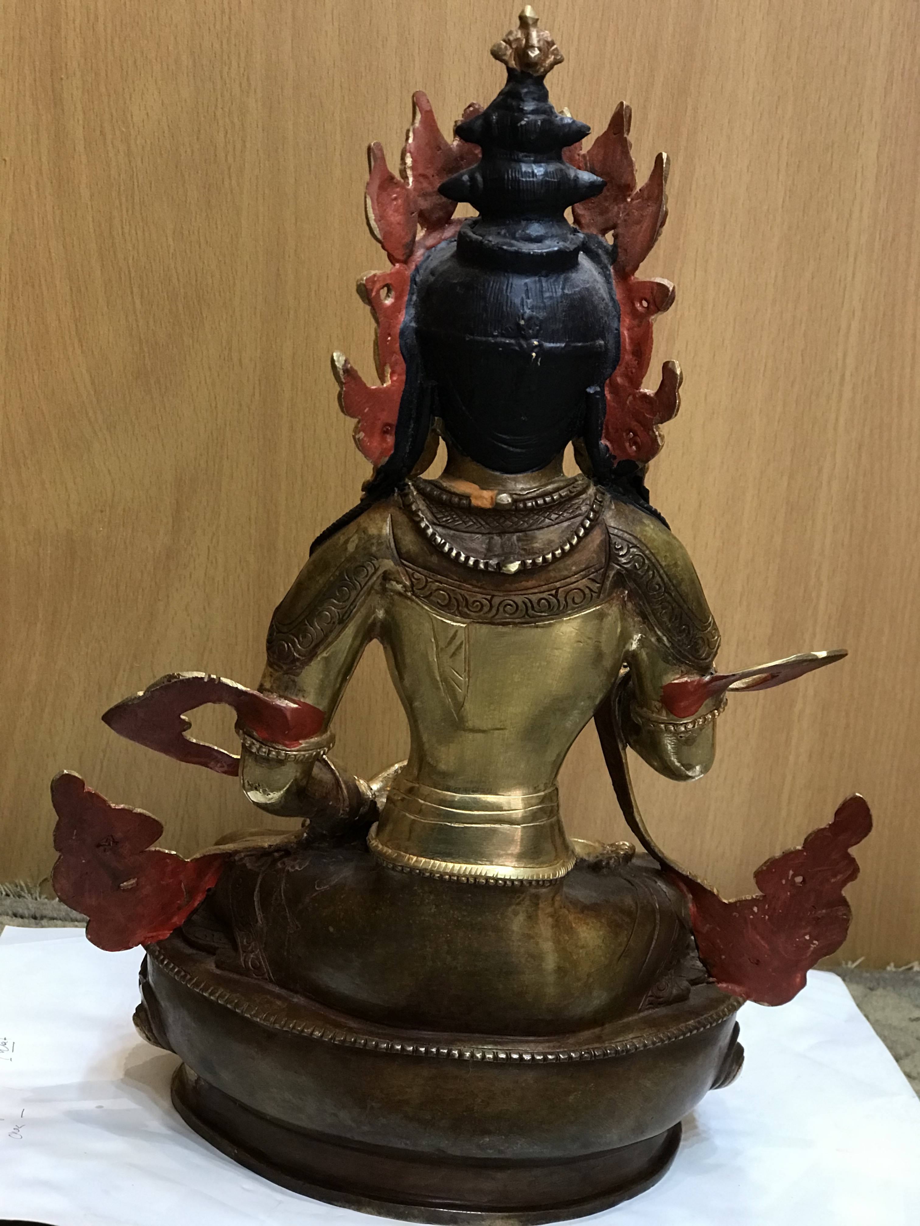 Our Tibetan Dorje Sempa statue is depicted wearing the crown and jewels of a Bodhisattva. The crown and jewels can be embedded with turquoise and red coral stones at the request of the buyer. The color turquoise is a special combination of blue and green. Indeed, blue signifies the purity of the Buddhas and green symbolizes their readiness to act. The special adornments embellish the statue and will inspire all those who lay their eyes on it.