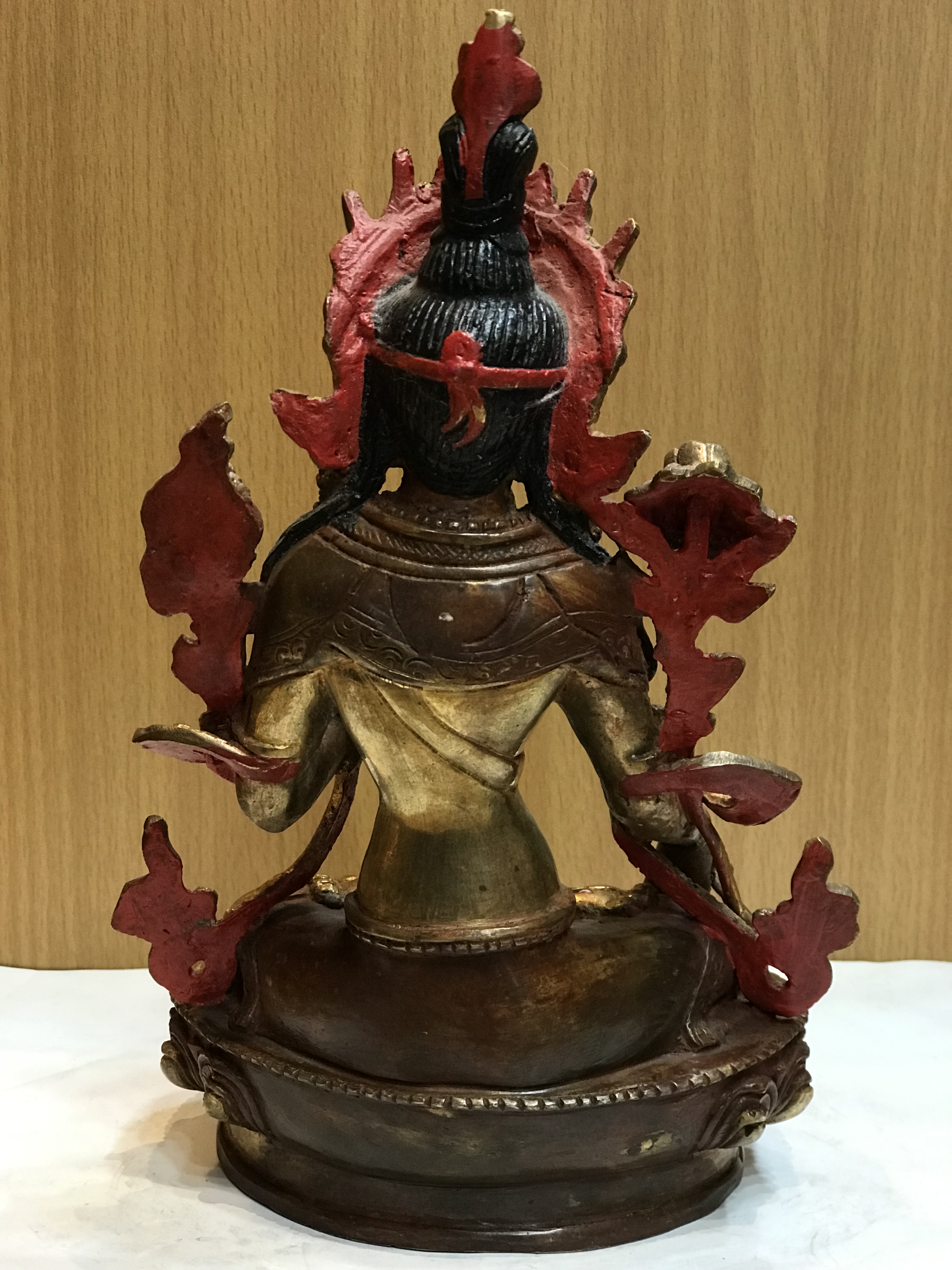 The color turquoise is a special combination of blue and green. Indeed, blue signifies the purity of the Buddhas and green symbolizes their readiness to act. Cintachakra wears them well and will also inspire all those who lay their eyes on the statue. Additionally, the color red pays tribute to Amitabha Buddha. The symbolic meaning of the color red is attachment; Tibetan Buddhists believe that meditation on the color red will transmute the poison of attachment into the sublime wisdom of discernment.
