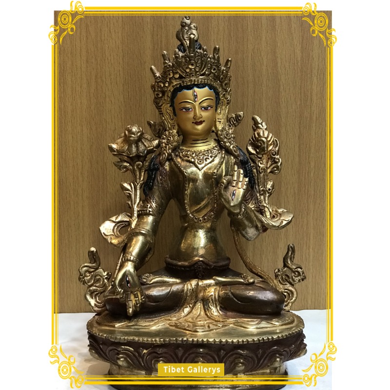 Artist created this Cintachakra statue with the jewelry and crown of a bodhisattva. The jewelry, crown and her robes have been embellished with semi-precious turquoise and red coral stones. The entire statue with the exception of her hair and face is gilded with the finest 24K gold. Additionally, in order to imbue the statue with a divine facial expression the face is painted with a mixture of mortar pure glass and fine gold.