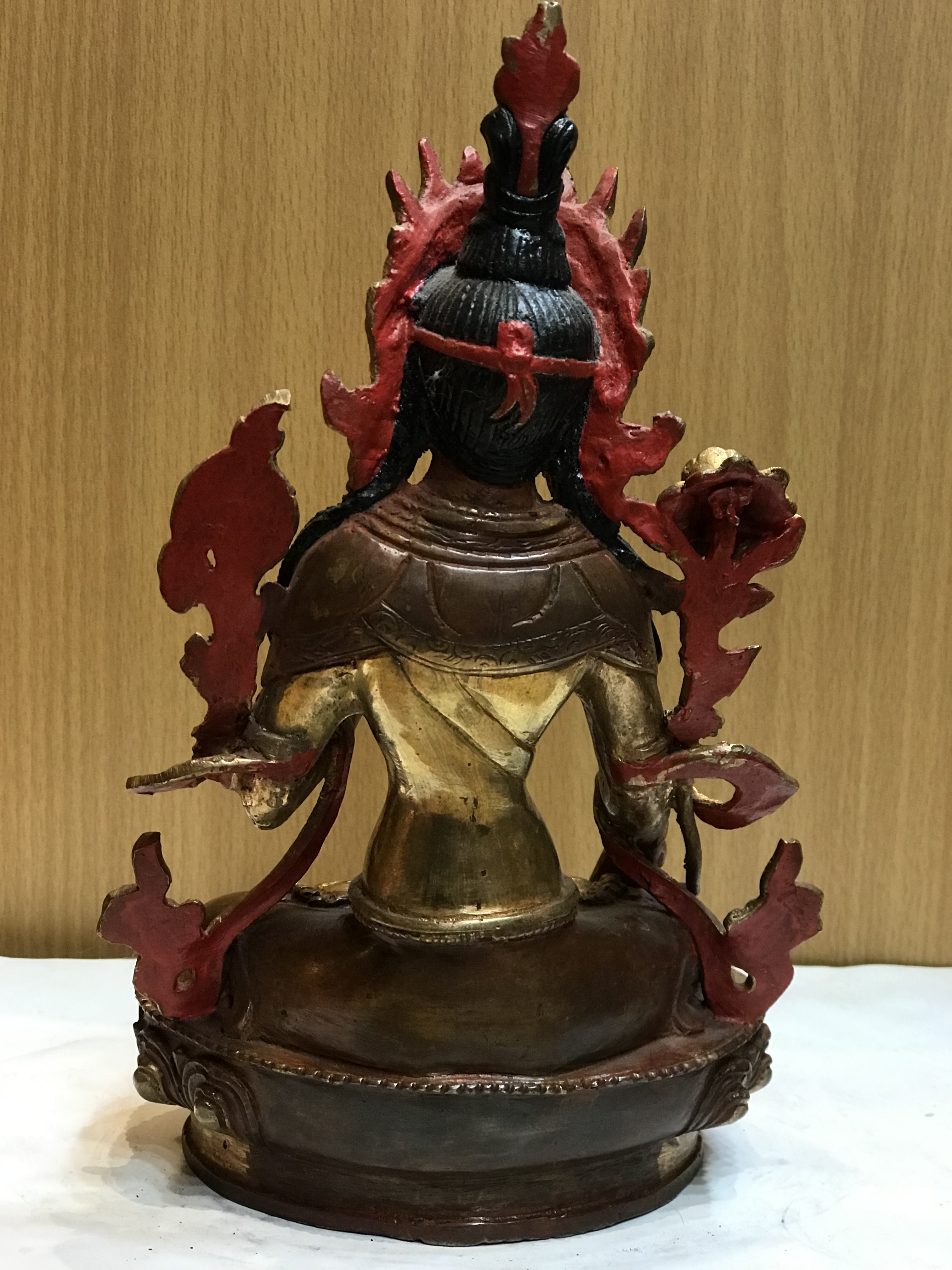 The color turquoise is a special combination of blue and green. Indeed, blue signifies the purity of the Buddhas and green symbolizes their readiness to act. Cintachakra wears them well and will also inspire all those who lay their eyes on the statue. Additionally, the color red pays tribute to Amitabha Buddha. The symbolic meaning of the color red is attachment; Tibetan Buddhists believe that meditation on the color red will transmute the poison of attachment into the sublime wisdom of discernment.